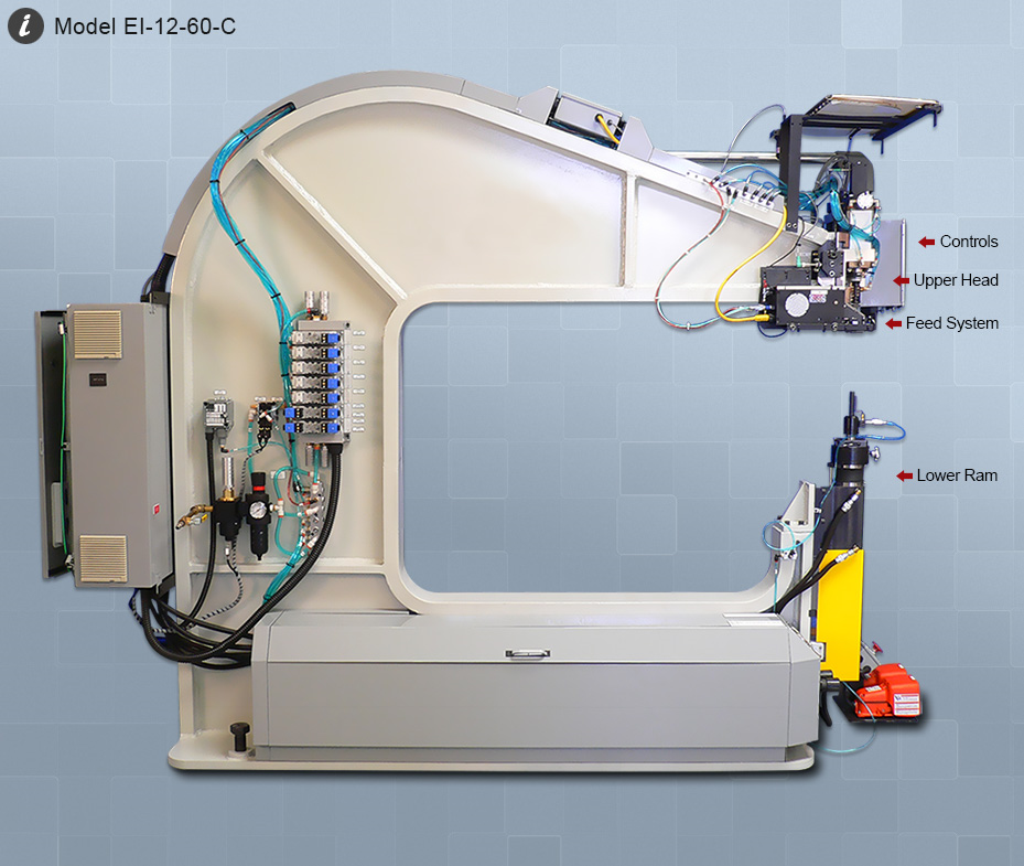 Models can be purchased with a 30" or 36" (inch) throat depth. All versions of the EI Portable C-Frame Rivet Machine operate on 110-volt AC power and standard shop air (85 PSI). Units can be purchased with full electrical capabilities.